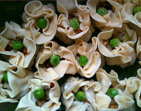 - 5. 接着就是烧卖的包法了,其实很简单,就算你不会包饺子也可以学会哦,拿一张烧卖皮摊在手心中,用勺子舀适量馅料放进面皮中间,然后轻轻用手收拢,将周围的面皮像收伞一样慢慢收拢起来,注意不要将口封死,让它像一个小花骨朵一样露出一个小口,再给烧卖简单装饰一下,准备一些豌豆米用开水绰好,在每一个做好的烧卖小口上轻轻的按上一颗青豆。