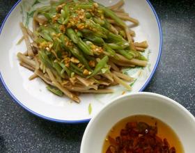 - 5. 豆角焯水后切丝,当面码。葱、蒜切末放入用适量的生抽、醋、糖调成的汁中,浸泡一会儿。