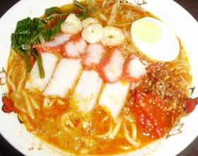 - 17. 拿碗放入面粉面,豆芽,空心菜,再放料~虾仁,鸡蛋,叉烧肉,鱼饼,舀入虾汤,再放入辣椒和油葱酥就可以吃了。