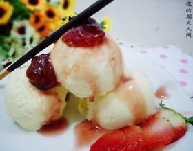 - 9. 最后用挖球器挖成球状,淋上草莓酱稍做装饰