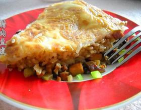 糯米饭上倒入配料及汤汁;沿锅边淋入少许油,煎一会,至饼皮焦黄。