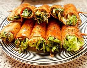 - 6. 取一张豆皮铺在案板上,在一端放上生菜。