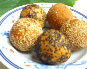 - 9. 锅中加入多一些油,烧到5成热的时候,放入麻团,转小火炸熟。麻团不太容易熟,炸的时候一定要用小火,不断翻动使其均匀受热,炸的时间大约是15分钟左右,熟了的麻团体积会变大并漂浮起来。