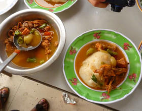 手抓粘糕,醮着汤汁食用。糕入口即化,汤汁酸辣可口。再佐以非洲土产果酒搜达比,既可给肠胃消毒,又可加重口味。
