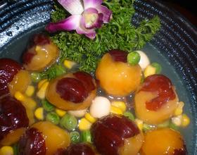 - 5. 用冰糖水加上莲子、青豆、玉米粒煮熟,然后加地瓜粉水煮成芡汁,把芡汁淋在蒸好的红枣糯米圆上。