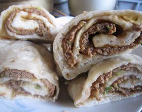 牛肉馅加适量水顺时针搅拌,加入葱、姜、白糖适量、盐、香油、味精拌匀备用。