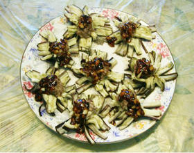 - 3. 将打好花刀的茄子上锅隔水蒸5分钟,这时候,茄子就已经变软了,再用筷子将茄子展开,摊成菊花状。