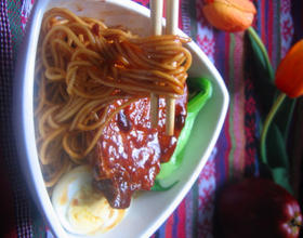 - 12. 面条中倒入大排汁拌匀,放上浇头即可。
