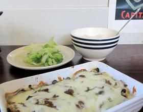 - 16. 表面均匀地铺上切好的芝士条,入烤箱220度10分钟左右即可。