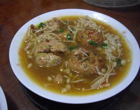 - 4. 油锅里倒少许油,放姜蒜爆香之后加入酱油和高汤下肉丸煮15到20分钟。加入金针菇再煮5分钟左右。(另外之中做法是在炸好之后,先用水把肉丸煮开一次,这样肉丸熟了,直接下去调好汁的汤锅里煮5分钟左右就可以,加入金针菇再煮5分钟左右就可以了)不过直接配调好的汁煮的话比较入味哦。看个人口味。