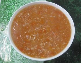 起油锅,油温达到约三成放入姜,蒜,葱,番茄丁,鱼茸,2L水,番茄沙司煮,煮沸后加盐,味精调味,出锅前加淀粉水溶液勾芡即可。