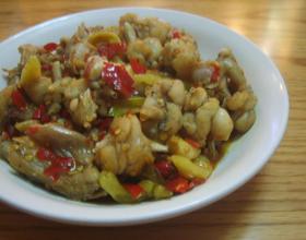 - 4. 锅中烧油,能没过牛蛙即可.油温9成热下牛蛙,用铲子轻轻推,避免粘连