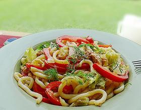 烧热锅倒入少许橄榄油,放入红椒丝大火炒片刻。