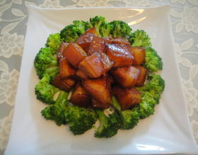 把西兰花摆在盘边,红烧肉摆盘中即成了。