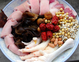 - 1. 将猪尾、鸡脚洗净,去毛。放到开水中焯3分钟去掉污血和浮沫!鸡脚容易烂提前夹出,再将猪尾焯水2分钟(屁股边上的东西煮久点)