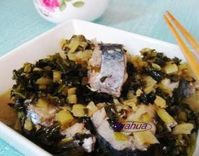 待鱼肉变成白中带黄时,就可以加入一点料酒微微滑动一下,继续加入雪菜平铺在鱼上面,再加适量水和少许的白糖(加白糖是为了提味,雪菜本身有点咸,中和下)。