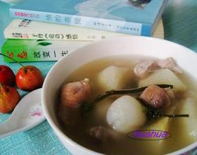 - 9. 汤盛出喝之前加入盐调味。因为此汤加了两种水果,不用加味精或者鸡精,加盐是为了更好的调和汤中的水果甜味。