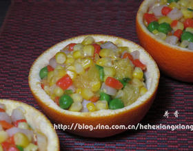 - 1. 将胡萝卜、马蹄切成大小一致的粒,葱姜切末,橙子的果肉撕成小块。(可以将橙子一切两半,掏出橙肉,留橙皮装盘装饰。)