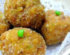 - 9. 将做好的肉丸在米粉里滚一下,让米粉完全包裹住肉丸。