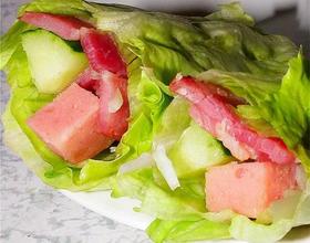 在菜上码放熟培根火腿黄瓜条大葱丝。