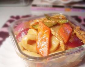 - 13. 添加料酒和酱油,放入胡萝卜翻炒。