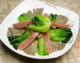 青菜洗净切段,平菇去杂质洗净瓣小片,方香肠切条.