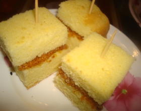 - 10. 将花生打成粉,加入蜂蜜搅拌成糊状,涂抹在烤好的蛋糕上,切成小块,用牙签固定就好了。