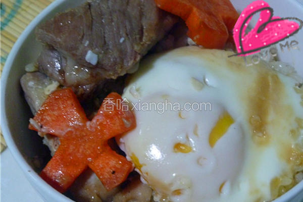 - 3. 米饭洗净放入电饭煲中,待出气孔有气冒出是将腌好的排骨,胡萝卜放进去周围撒些油盖上锅盖继续煮,等排骨差不多熟时打两颗鸡蛋(鸡蛋可以是溏心也可以全熟)将耗油酱油汤搬好,撒进去增加味道。就等开锅了。由于时间太紧好几个地方没有照大家只能看我写的了,抱歉哦~。