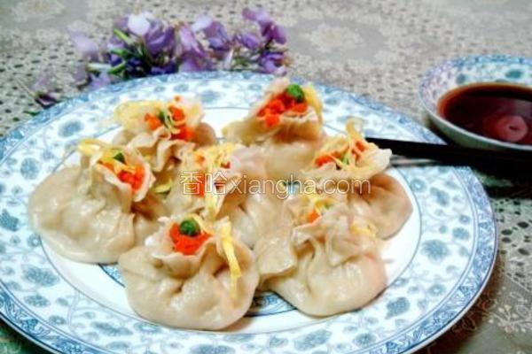 - 16. 烧麦入笼大火蒸5分钟,然后掀盖撒上少许蛋皮丝便可出锅,出锅后码盘儿便可上桌食用。