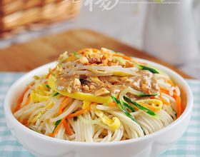 和面条,蛋丝拌在一起,吃的时候撒花生碎即可。