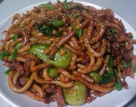 倒入牛肉丝后,加入生抽翻炒均匀后加入老抽少许,大火翻炒。