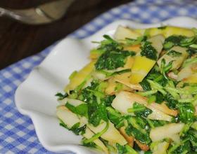 煸炒至春笋表面微干时,加入豆干片,一同煸炒。