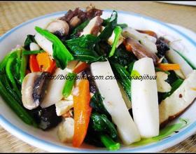 等年糕变软后可以放入焯好水的菠菜,翻炒几下,然后加入盐和味精调味出锅。