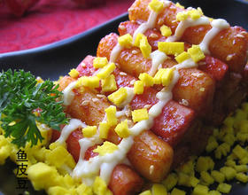 蛋黄上铺一层年糕。