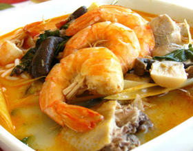 起锅放油,放入香茅、罗勒、姜、蒜、辣椒爆香,然后放鸡和虾的汤,加两三汤匙冬阴功汤酱、椰奶、放冬菇和蘑菇、鲜柠檬叶,等汤烧开后放入爆过的虾。