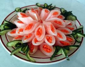 - 7. 把切好的萝卜卷在盘中摆成菊花形,黄瓜围边即成。