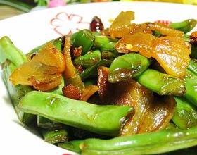 锅内热油先放一半的蒜米,然后爆炒腊肉。
