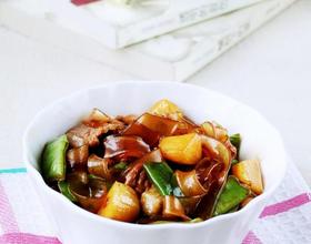 - 8. 然后放入宽粉转小火焖烧约十分钟即可,中间要勤翻炒,以免宽粉粘锅。