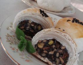 附上五仁馅做法:1、把核桃仁、开心果、杏脯切碎后和葡萄干、黑芝麻、葵花籽仁混合拌匀 2、把白糖加入水中搅拌至溶解,再加入酒、色拉油搅拌均匀。 3、把1和2混合搅拌均匀 4、分次加入熟糕粉至馅料可以揉成团即可