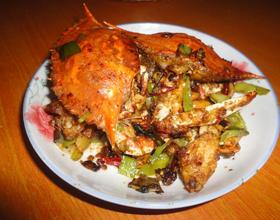 等蟹肉煎至金黄色,往锅里放入生姜、蒜苗、辣椒、花椒,翻炒几下后依次加适量盐、料酒、酱油、郫县豆瓣酱、白糖,在出锅前加一些酒鬼花生,翻炒片刻出锅。
