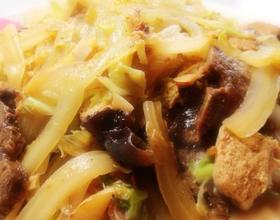 把熟肉、豆腐放入锅里翻炒,放入料酒、老抽、生抽。