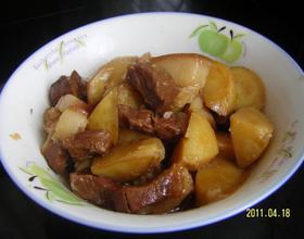 肉焖熟后打开锅盖,把土豆倒进去,放盐、鸡精调味,然后再盖上盖子烧开小火5分钟关火即可。