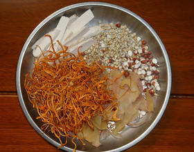 取虫草30g,金丝螺30g(要先泡30分钟,最好用温水泡浸),薏米25g,茨实25g,淮山(可放可不放),鸡半只(或适量排骨)。所有材料清洗后一同放入锅里。