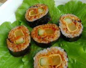将鸡蛋片铺在辣酱上,放上黄瓜和大根条。
