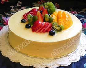 - 17. 在蛋糕上随意放上水果装饰,倒入放凉的吉利丁液,放冰箱冷藏30分钟至凝固。