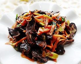 热锅下油下姜丝煸香加入腊肝煎煎。