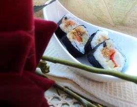- 16. 一张紫菜,放适量米饭,手指蘸冷开水,把米饭稍微摁压结实,涂一层沙拉酱。