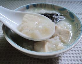 在熬好的粥中放入鳌花鱼头,豆腐,鱼汤六汤勺。