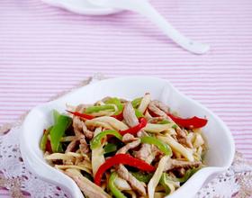 炒锅放油烧热,下入姜丝、肉丝煸炒至肉丝变白。
