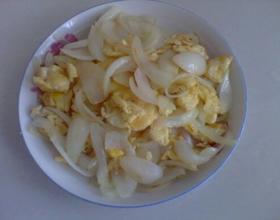 - 6. 将洋葱丝倒入锅中,翻炒。不用加油了,刚煎蛋剩下的就够了。